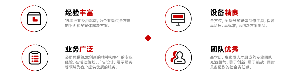 憑借銳意創(chuàng)新的精神和多年的專業(yè)經驗,在活動策劃、廣告設計、展示服務等領域為客戶提供優(yōu)質的服務。